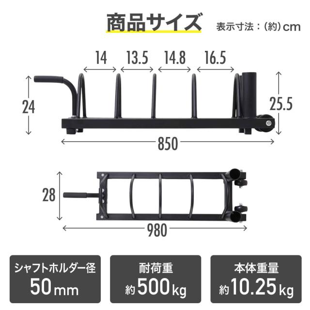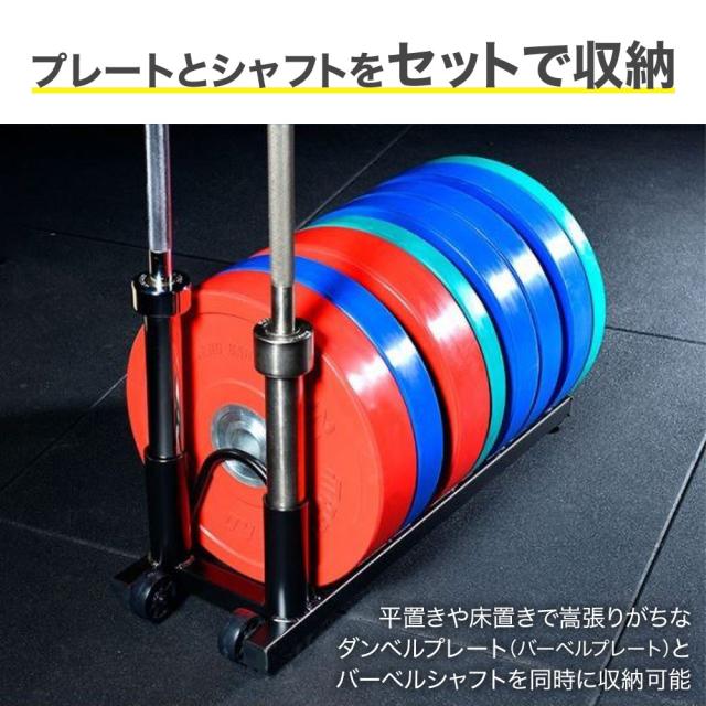 プレートだけでなく、バーベルシャフトを差し込んで収納できるシャフトホルダーが2個付いた『ローラー搭載プレートラック』