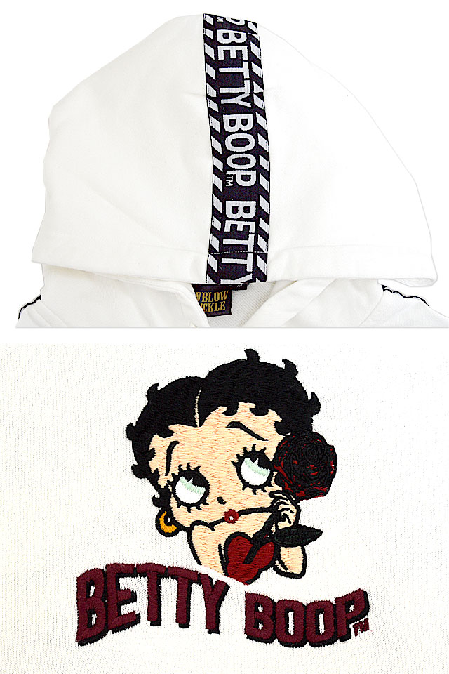 ロウブロウナックルから「ロウブロウナックル×BETTY ROSE BIGプルパーカー(561873)」のご紹介です。 大きな瞳とぽってりした赤い唇が印象的な女の子、ベティ・ブープ(Betty Boop)。 今回は裏毛タイプのプルオーバーパーカーです。 袖には「BETTY BOOP」のロゴが入ったラインを配置。 | |||||||||||||||||||||