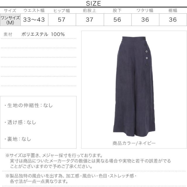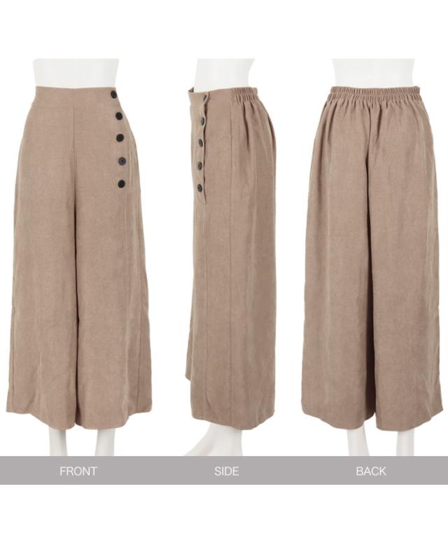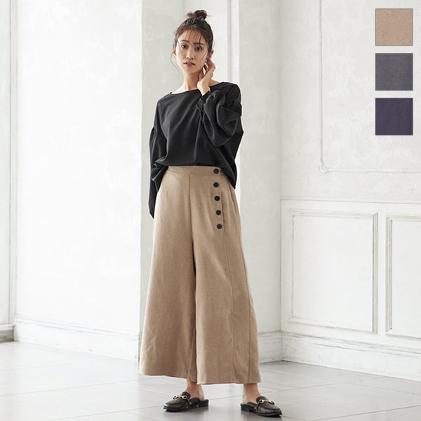 サイドにあしらったボタンが目を惹くワイドパンツ。ワイドシルエットですが大きめボタンが縦のラインを作りだし細見え。お手持ちのシンプルなトップスともスタイリングしやすいカラーバリエーションとほどよいデザインが魅力的〇【素材・サイズ感】ソフトで、少しハリと起毛感がある素材。バックウエストはゴム仕様、サイドボタンの開くので着脱がしやすく、履き心地楽ちんです。ワイドシルエットで太ももやふくらはぎのラインが響きにくく、ストレスフリーな着用感。自宅でもお出かけでも着回しやすい1枚〇※キャンセル/変更不可※お届けまでの日程について