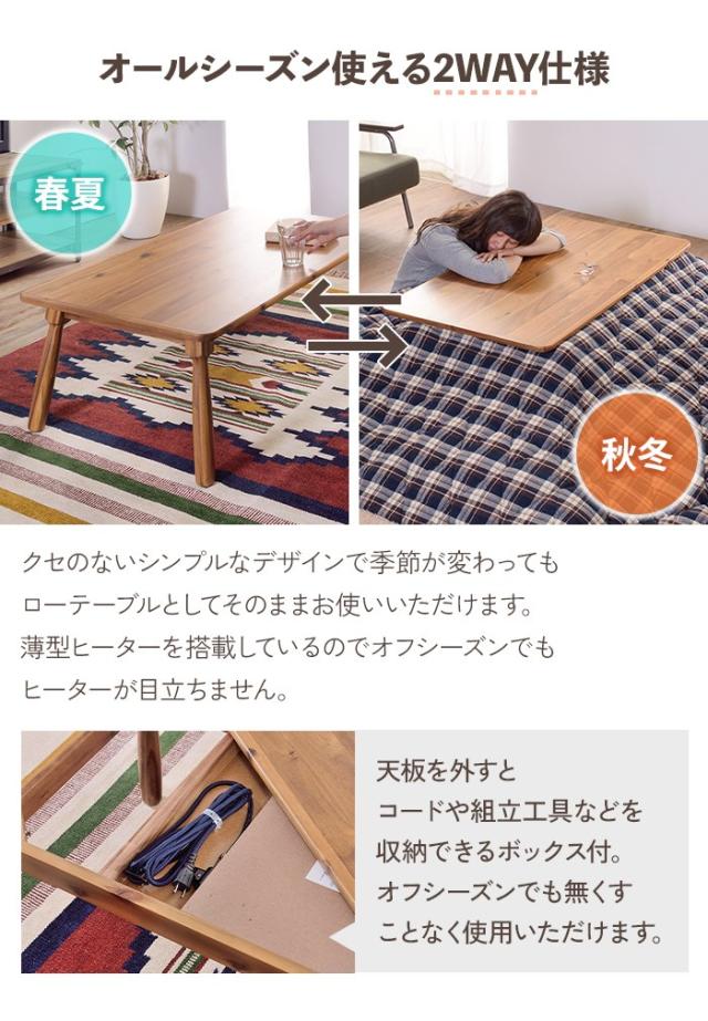 薄型ヒーターを採用することでヒーターが目立ず、天板を外すとコードの収納もあり、センターテーブルの感覚でオールシーズンお使いいただけます。