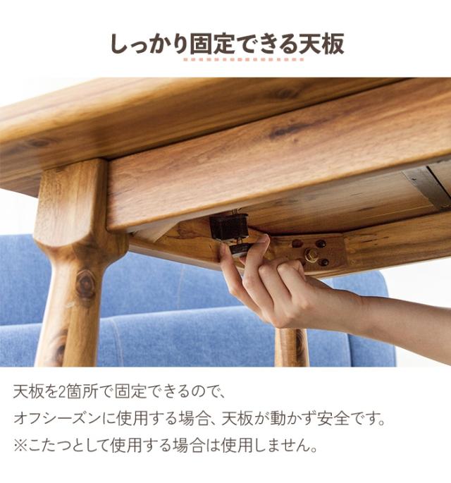 | 深みのあるアカシア材を使用したヴィンテージテイストのこたつテーブル。 テーブルのデザインを活かすため、木目の強いアカシア材を使用。 木目や節、色合いは天然木の味としてお楽しみいただけます。 天板表面には耐久性に優れたウレタン塗装を施してあるので、水や汚れに強く、飲み物をこぼしてしまってもサッと拭くとるだけでお手入れラクラク。 薄型ヒーターを採用することでヒーターが目立ず、天板を外すとコードの収納もあり、センターテーブルの感覚でオールシーズンお使いいただけます。 2か所で天板を固定できるので、オフシーズンに使用する場合も天板が動きません。 ※こたつとして使用する場合は使用しません。 脚部は八の字デザインで胡坐をかいても足が当たりにくい設計となっています。 |