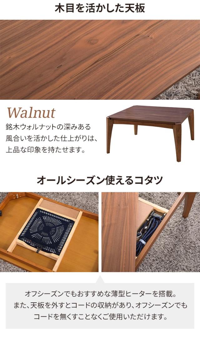 | こたつ 炬燵 ウォルナット 天然木 リビングコタツ センターテーブル 木製品 カフェテーブル こたつ布団ずれない構造 北欧 おしゃれ シンプル モダン 和室 洋室 ひとり暮らし テーブル 幅75センチ |