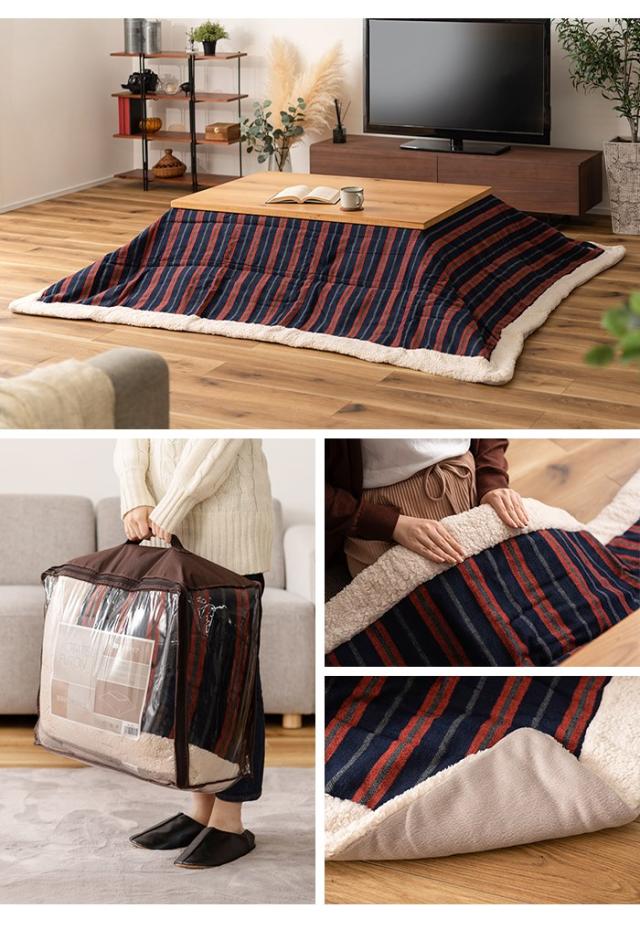 | レトロ感のある3色のストライプ柄がおしゃれなこたつ布団。 お部屋を圧迫しない薄型タイプで3〜4人用に適した190×230cmサイズ。 シープボアが熱を逃がしにくく、保温力のある機能的なお布団です。 裏面は肌触りのよいフリース素材を使用しています。 薄型なので使わないシーズンは折りたたんでもかさ張らずコンパクトに収納できます。 |