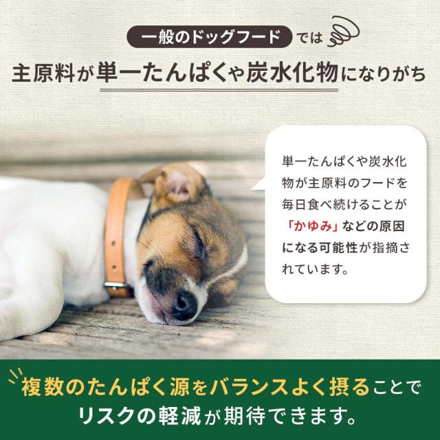 一般のドッグフードでは、主原料が単一たんぱくや炭水化物になりがち。
