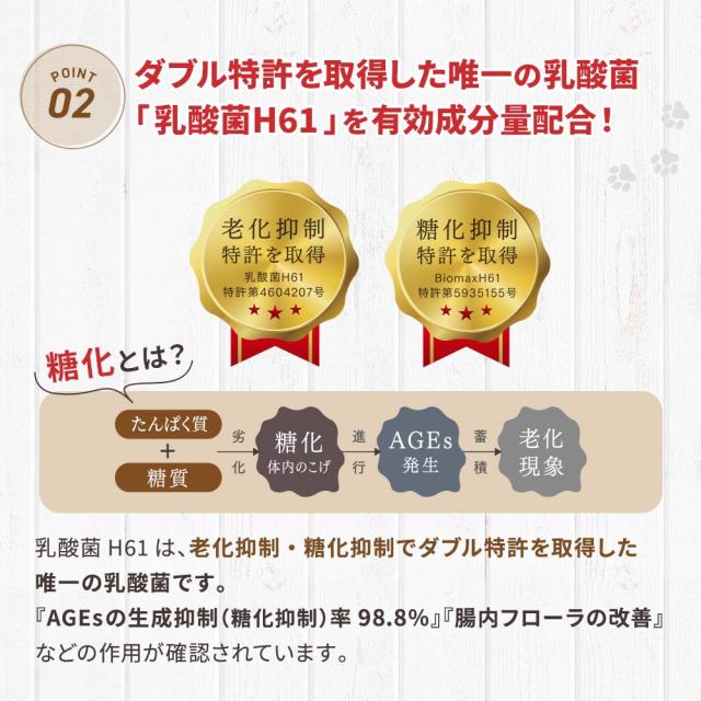 乳酸菌H61は、老化抑制・糖化抑制でダブル特許を取得した唯一の乳酸菌です。