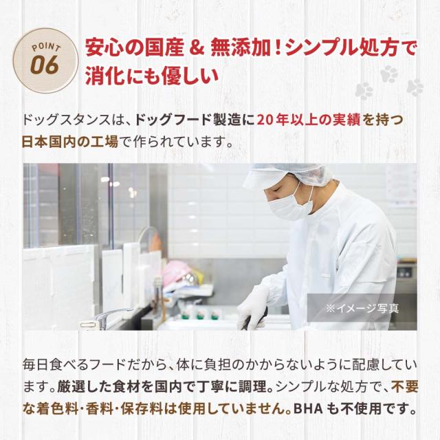 ドッグスタンスは、ドッグフード製造に20年以上の実績を持つ日本国内の工場で作られています。