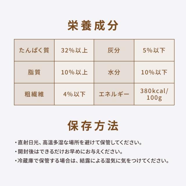 【栄養成分】たんぱく質 32%以上 灰分 5%以下 脂質 10%以上 水分 10%以下 粗繊維 4%以下 エネルギー 380kcal/100g