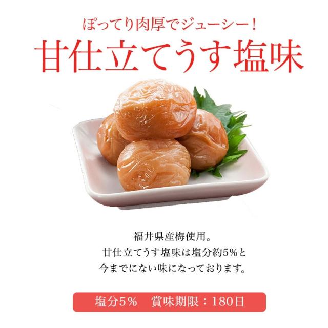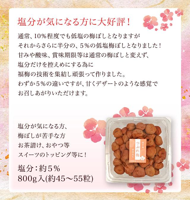 - 塩分をできる限り控え、あっさりと甘〜く仕上げました。うす塩味(約塩分10%)のもっと塩分の低いのないの?とのお客様のお問い合せが多い中、梅本来の味を損なわず、塩分を抑える事に成功しました。何年もかかって仕上げた福梅の自信作です。その、梅干しが残念な事に樽の底や詰め作業の中で潰れてしまいます。お家で食べるにはつぶれ梅で十分という方に耳よりなお知らせです!そのまま食べたり、お茶受けにも最適です。また、梅干しの苦手な方やお子様にも食べやすくなっております。