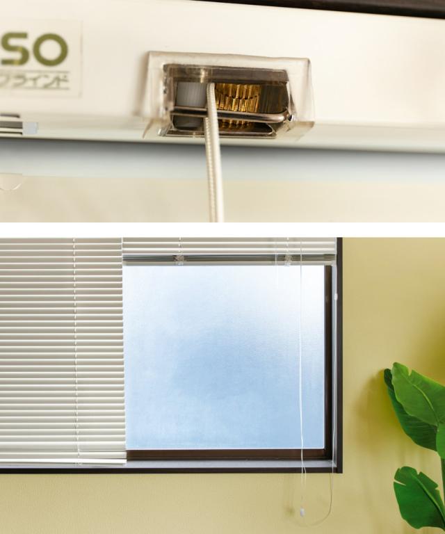 昇降コードを真下に引くとブラインドが上がり、傾けると途中で止まります。降ろす時はコードを内側にして引きます。体重がかかると外れるセーフティージョイントを採用しており、 コードの引っかかりによる事故を防ぎます。