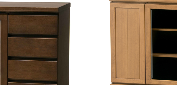 | 小物整理に最適な引出し収納 5杯の引出しは、リビング周りの小物の収納に便利です。上下どちら側からも掴むことができる引き手で、引き出しやすい仕様です。 | 生活感を隠すことができる板戸 中身が見えない板戸は、閉めて置けば生活感を隠すことができるので来客時にも便利です。 |