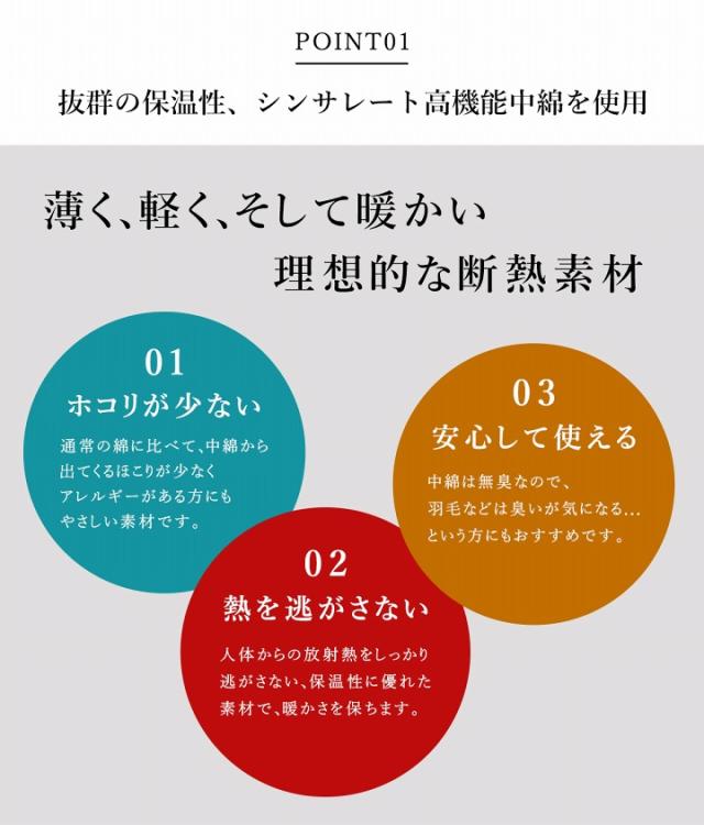 ■ シンサレート高機能綿は、動きを妨げる事なく快適な暖かさを提供する高機能中綿素材です。