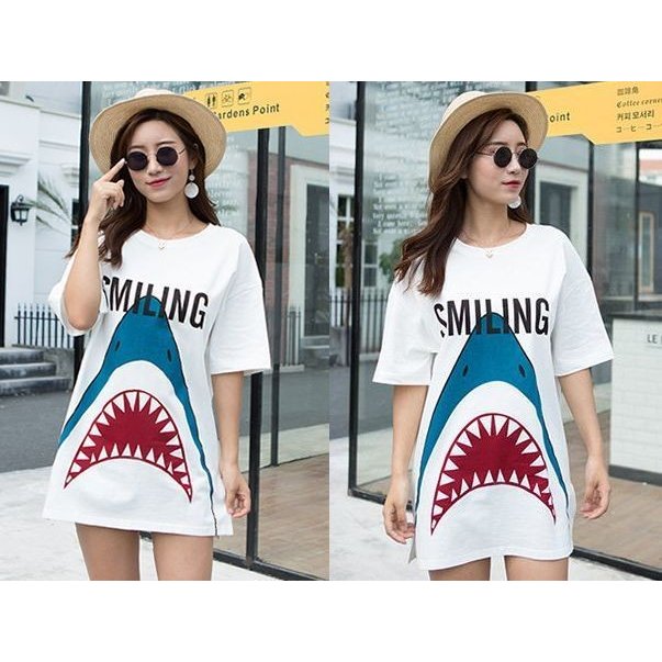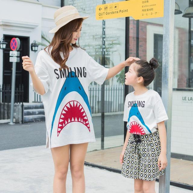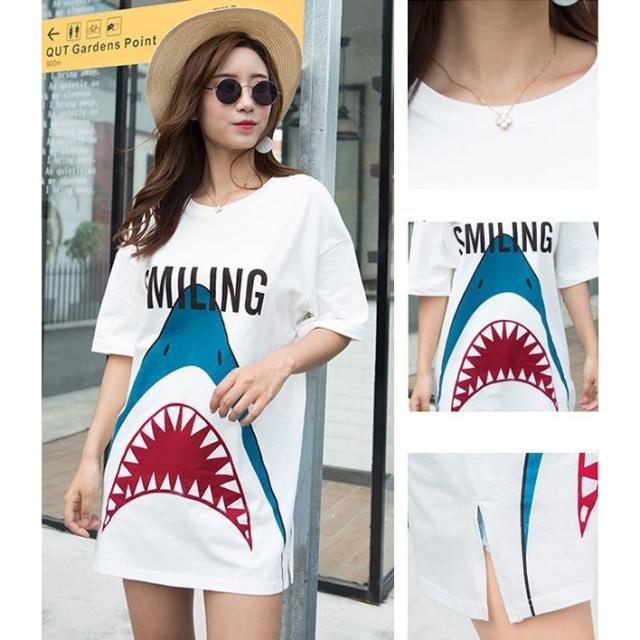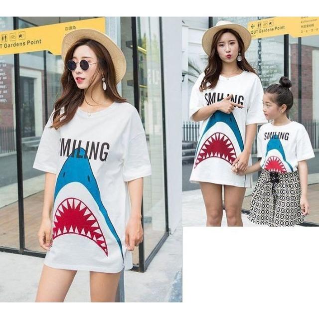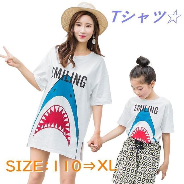 半袖Tシャツ キッズ ジュニア 子供用 男の子 女の子 レディース メンズ トップス ラウンドネック ロング丈 スリット プリント サメ 親子 ペアル
