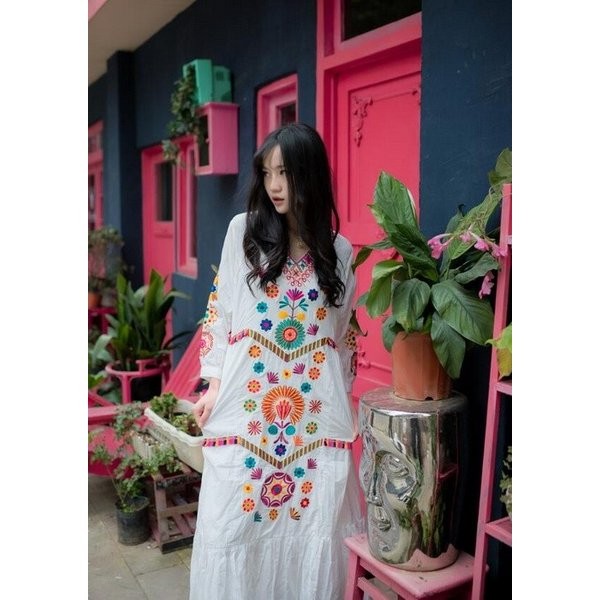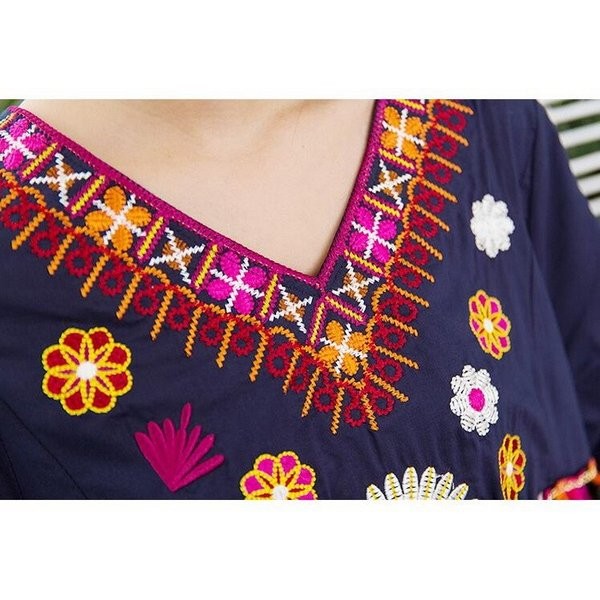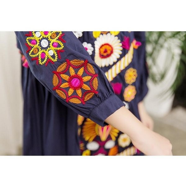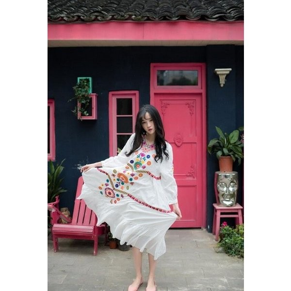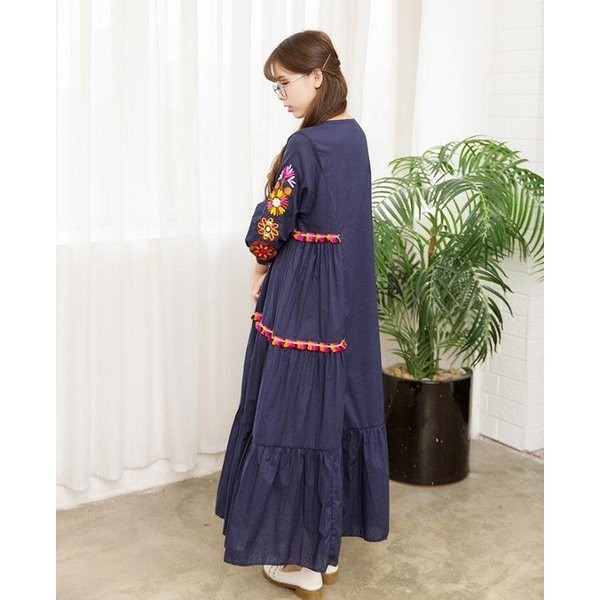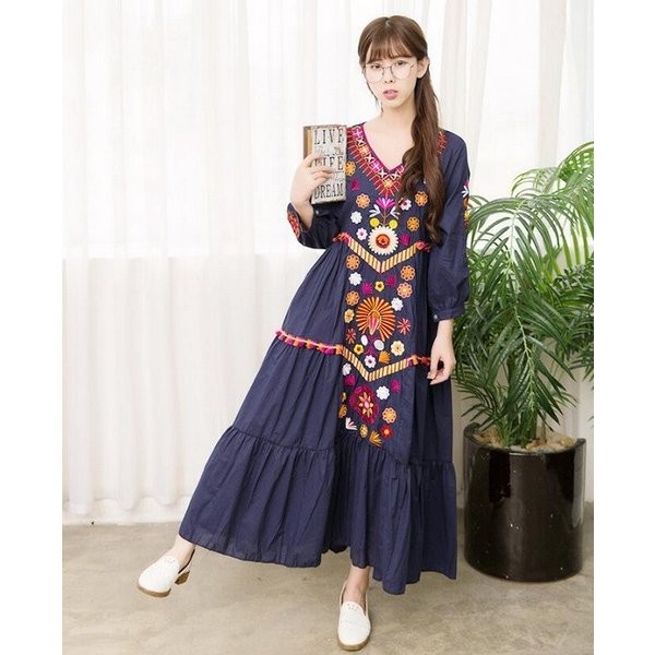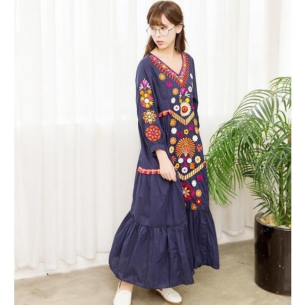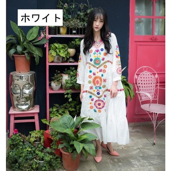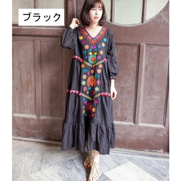 ボヘミアン風 ワンピース レディース タンクワンピース ロングワンピース 長袖 Vネック ロング丈 リゾート 刺繍 花柄 ホワイト ネイビー ブラック