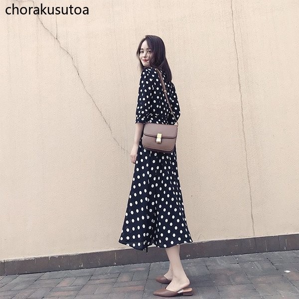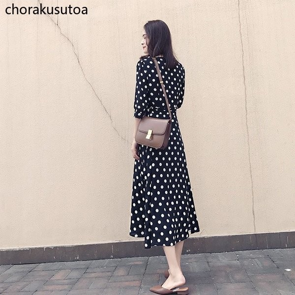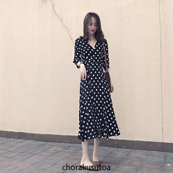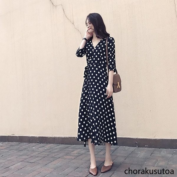 ワンピース レディース きれいめ ロングワンピース 40代 Aラインワンピース ドット柄 大人 可愛い シフォンワンピース Vネック 春 夏 大きいサイズ 着痩せ