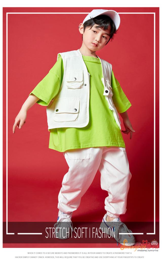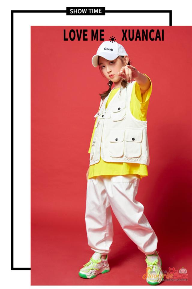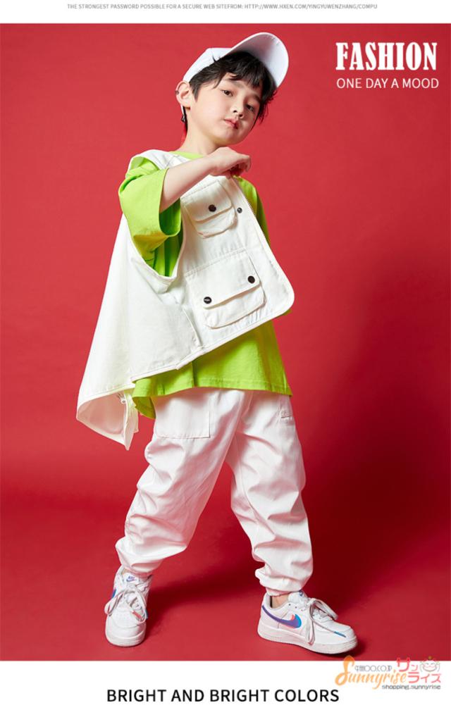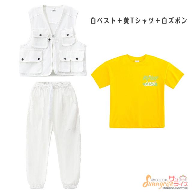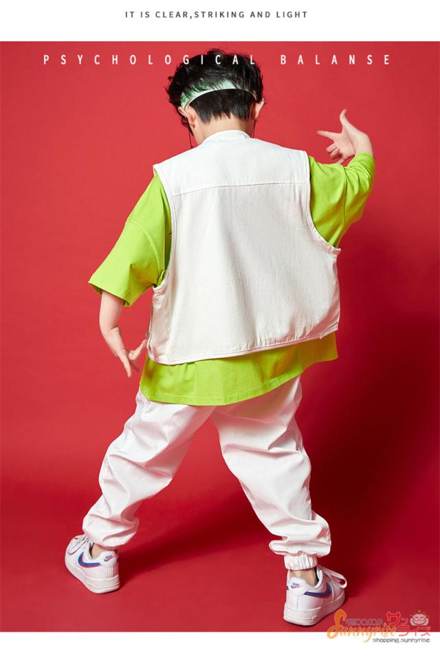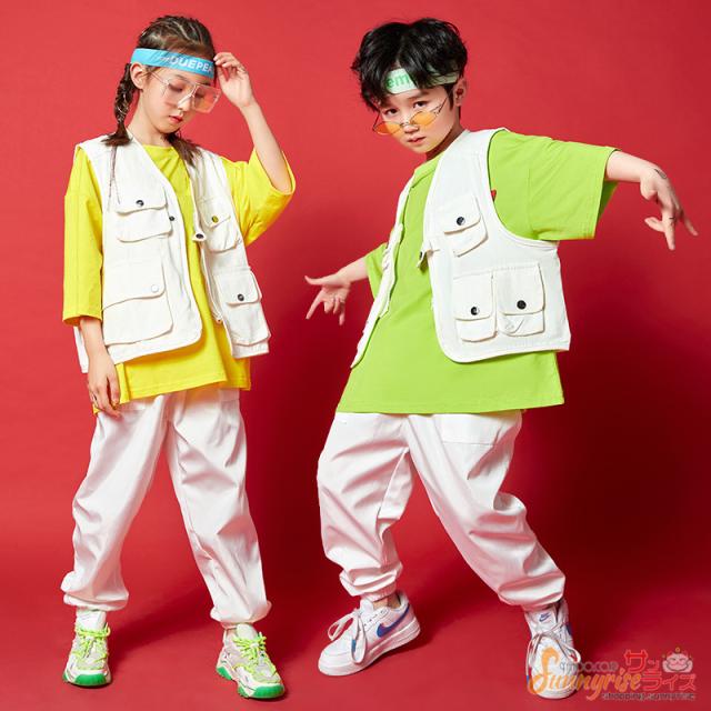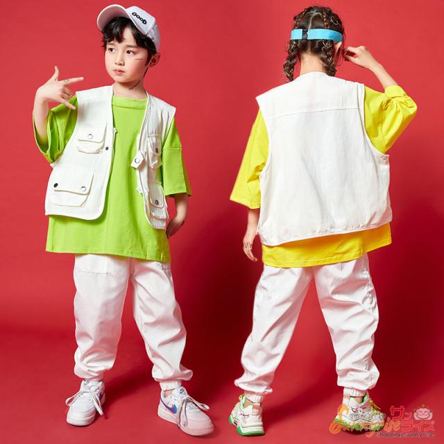 キッズ ダンス衣装 HIPHOP ヒップホップ 子供服 白ベスト 白ズボン 黄 蛍光色トップス 男の子 女の子 ステージ衣装 練習着 演出服 体操服
