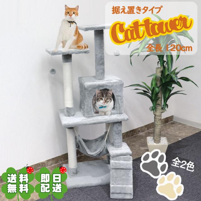 キャットタワー 全長120cm おしゃれ スロープ 爪とぎ おもちゃ ハウス 室内 据え置き 人気 ハンモック 運動不足 安定 かわいい 多頭飼い 麻紐 省スペース スリム 爪研ぎ 子猫 グレー ベージュ ストレスフリー