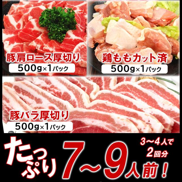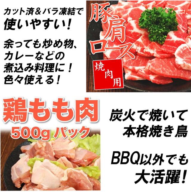 | 内容量 | 牛バラ(カルビ)厚切り 300g×1パック 豚肩ロース焼肉用 500g×1パック 豚バラ厚切り 500g×1パック 鶏ももカット済 500g×1パック |