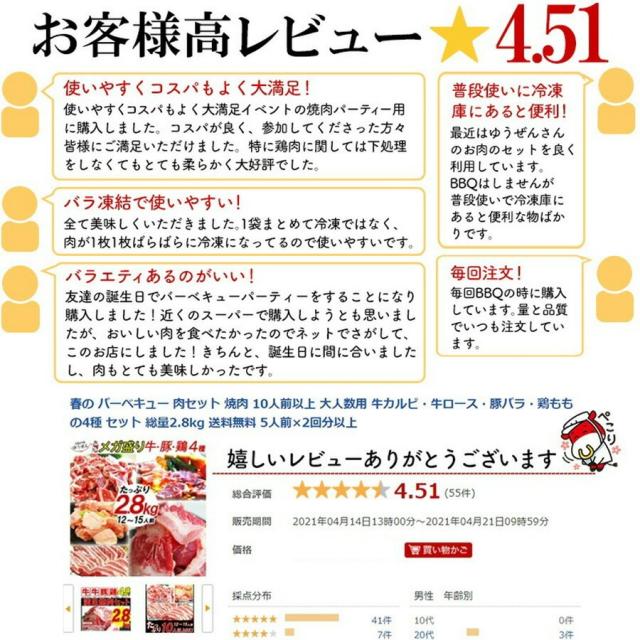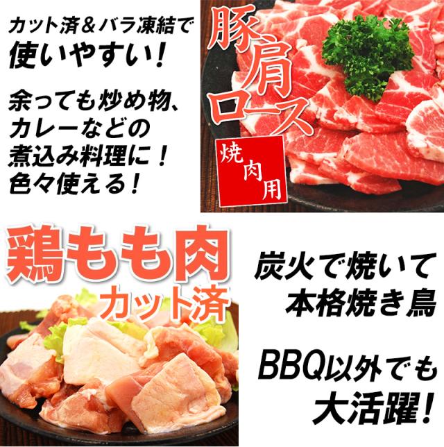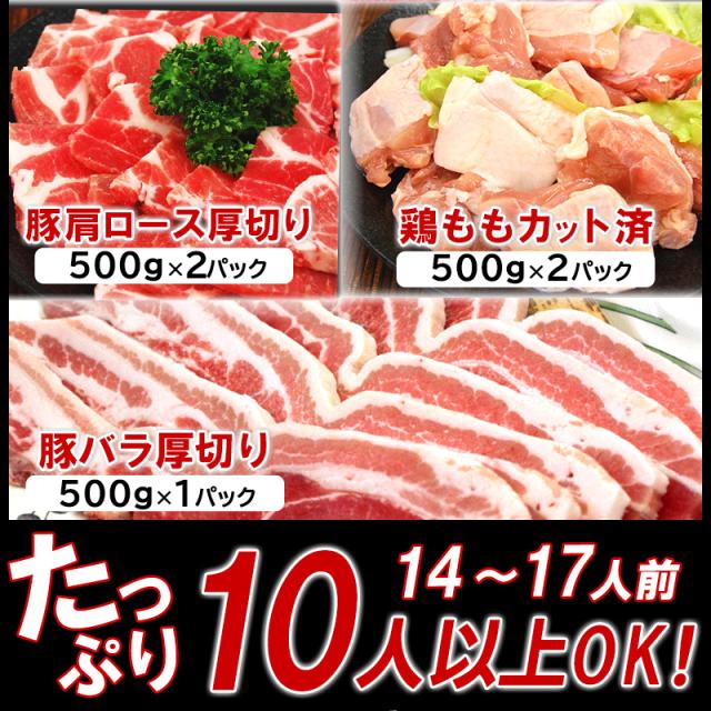 | 内容量 | 牛バラ(カルビ)厚切り 300g×3パック 豚肩ロース焼肉用 500g×2パック 豚バラ厚切り 500g×1パック 鶏ももカット済 500g×2パック お肉屋さんのたれ 160g×2 |