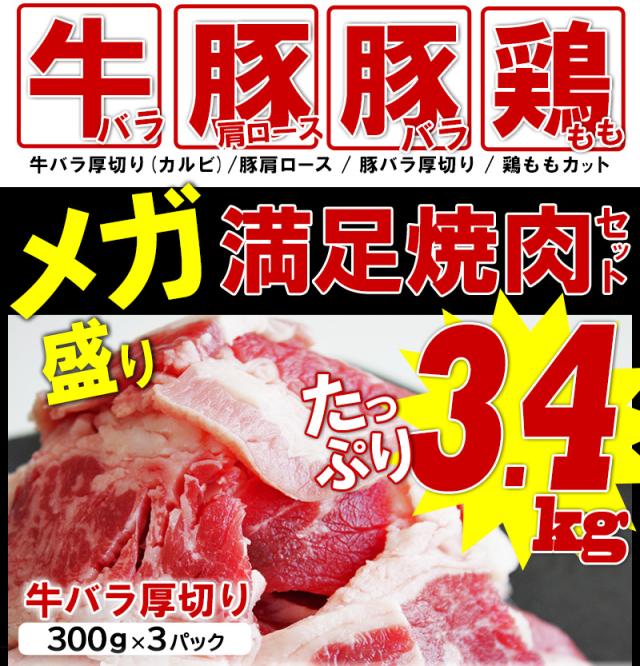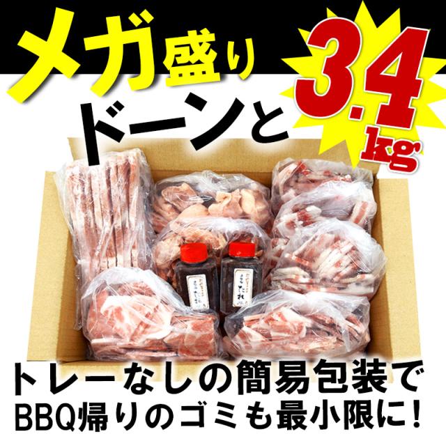 [入荷未定] メガ盛り 3.4kg BBQ バーベキュー 肉 セット 焼肉 精肉 10人前以上 大人数用 牛カルビ 豚肩ロース 豚バラ 鶏もも 4種+お肉屋さんのタレ2本付き 送料無料 BBQ食材セット 焼き肉 agesugi_sgu