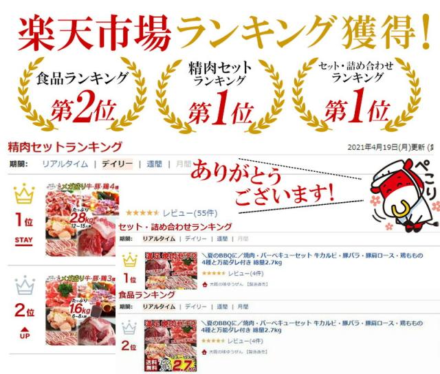 | 原材料名 | 【牛バラ(カルビ)厚切り】(アメリカ) 【豚肩ロース焼肉用】(スペイン・カナダ・アメリカ・メキシコ等) 【豚バラ厚切り】(スペイン・フランス等) 【鶏ももカット済】(ブラジル) 【お肉屋さんのたれ】 |