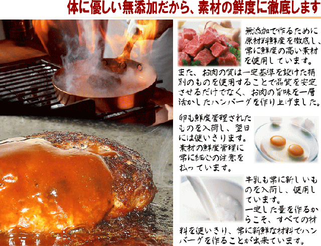 | Point-1 | 余計なものは一切入れていません。当たり前ですが、本来『お肉はジューシー』です。『玉ねぎは甘い』です。『卵は濃厚』です。『牛乳はまろやか』です。当たり前ですが、それらを活かすレシピ。磨きをかけたレシピ作りがこのハンバーグを生んでいます。 | |