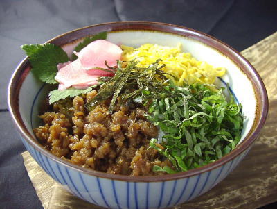 | 鶏のつみれのそぼろ丼 [作り方] 材料(鶏カルビ焼き、ご飯、海苔、水菜など) 1.鶏のつみれ」を解凍し、フライパンで火を通しながら醤油、みりん、お酒で軽く味 をつけます。 2.それをあつあつのご飯にのせて、金糸玉子・大葉の千切り、生姜などもお好み でトッピングすれば出来上がり♪ ※「鶏のつみれ」には予め味がついていますので、お好みによりほんのちょっと味 つけしていただくだけです。 | ![]() |