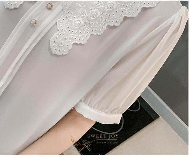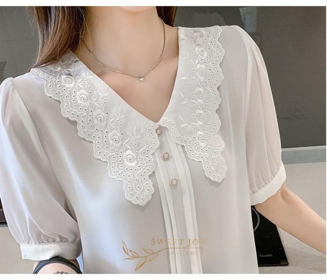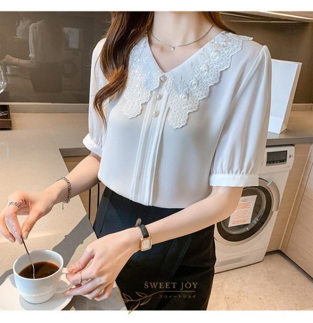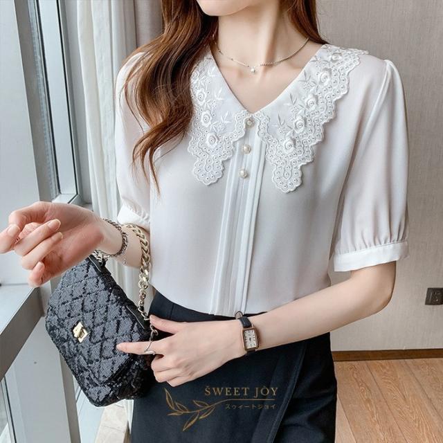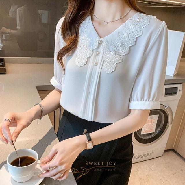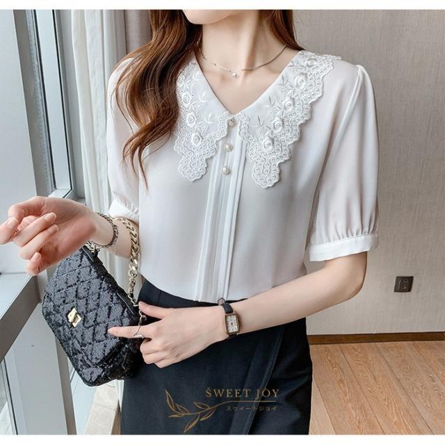 ブラウス レディース 40代 春夏新作 オシャレブラウス シフォンブラウス白 レース花刺繍 Vネックブラウス 半袖トップス 韓国風 大人通勤 ゆったりシャツ 30代