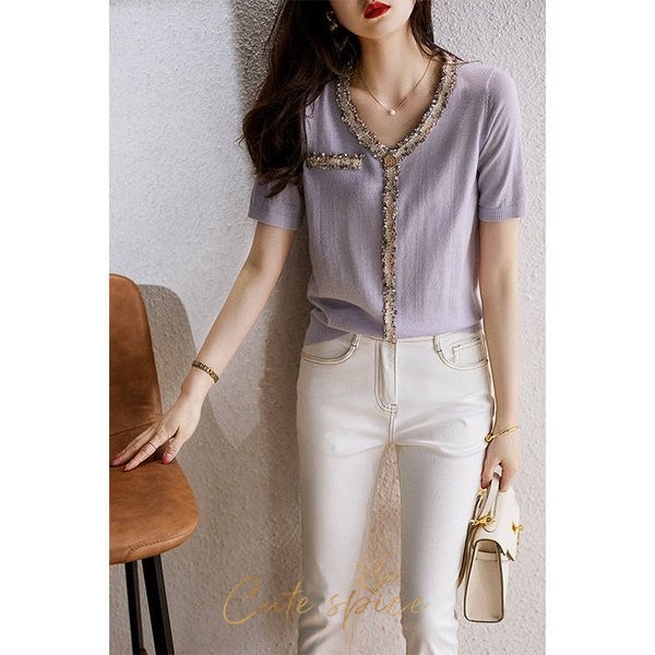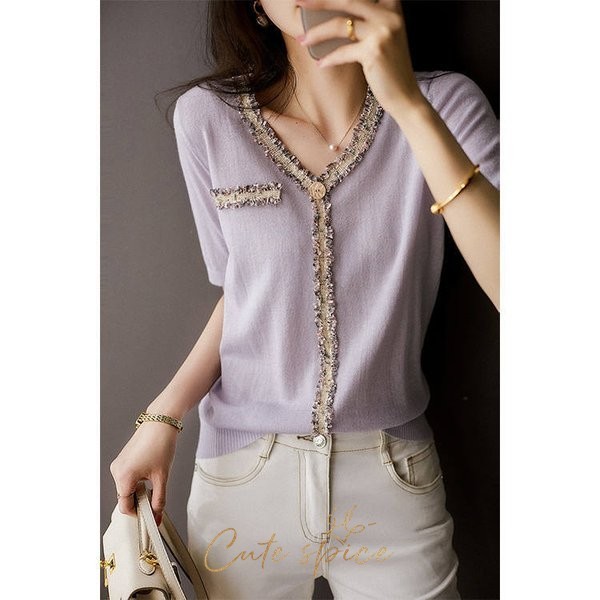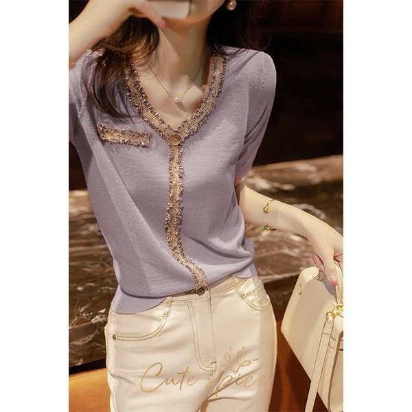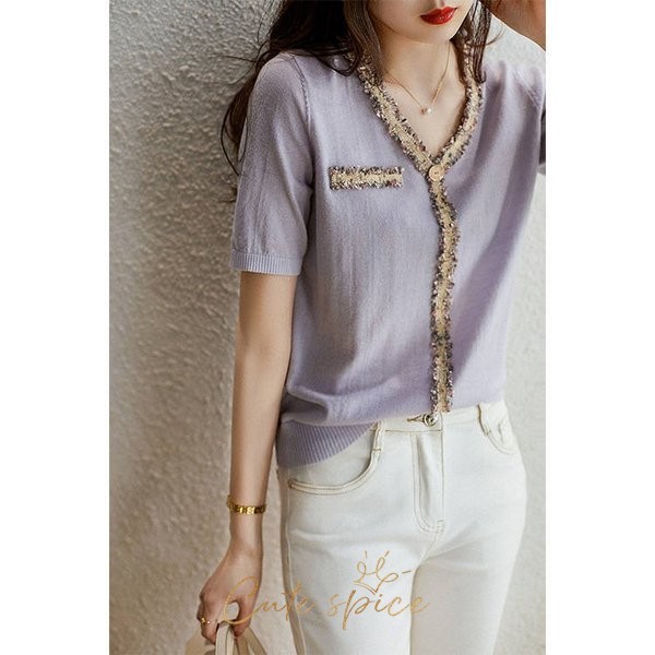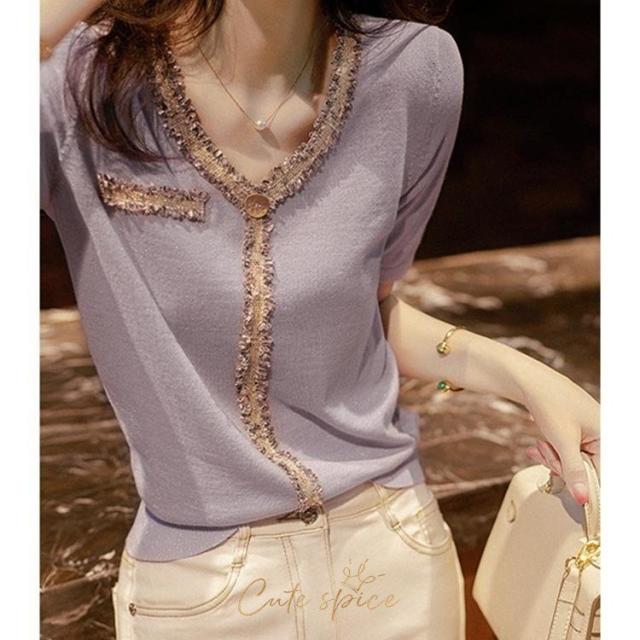 ニットTシャツ トップス レディース きれいめ 40代 春夏 半袖トップス Vネック オシャレ ブラウス 丸首 tシャツ 韓国風