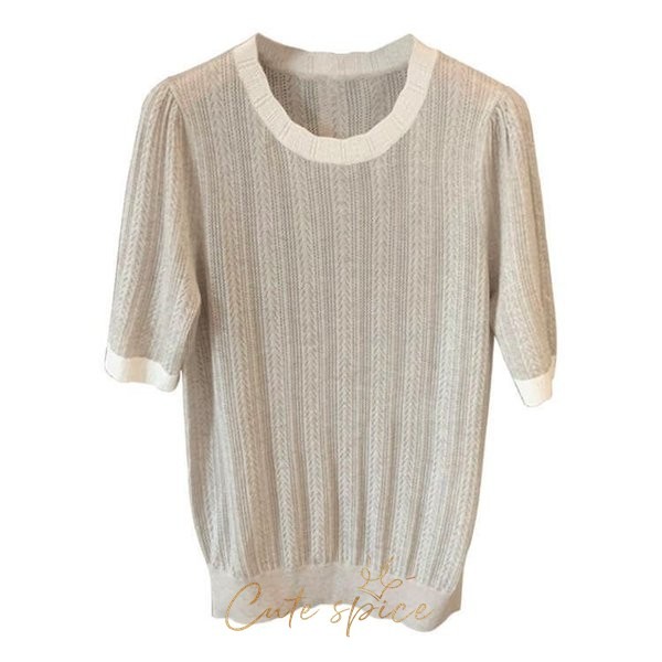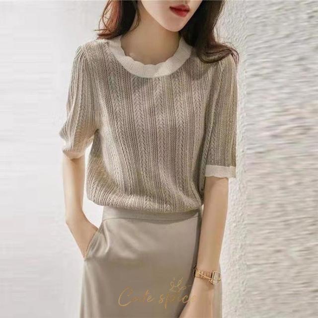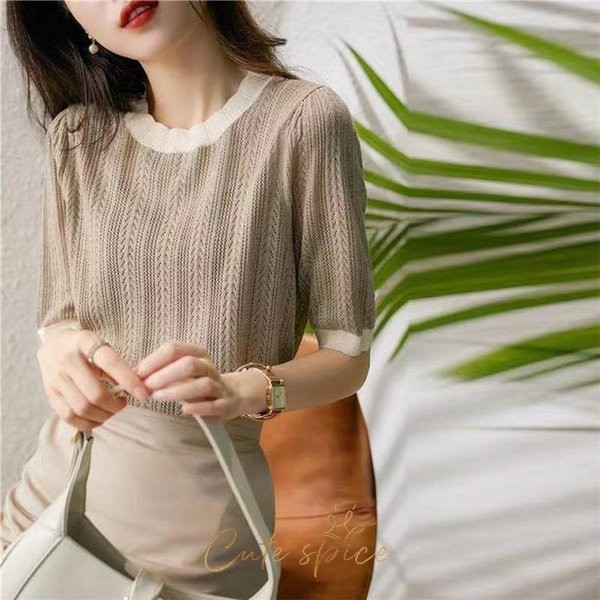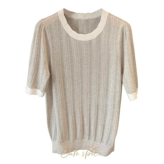 ニットTシャツ トップス レディース きれいめ 40代 春夏 半袖トップス 配色 オシャレ ブラウス 丸首 tシャツ 韓国風