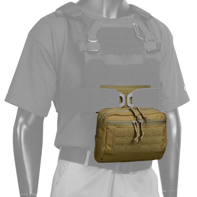予備のマガジンや無線機、応急用品、ゴーグル、貴重品など、様々な小物の携行に最適な2ポケット仕様の中型拡張ポーチ。SPITFIREおよびSPITFIRE MK II、HELLCAT等のフロントフラップに挟み込んで装着します。もちろん他社製プレートキャリアでの使用もOK。