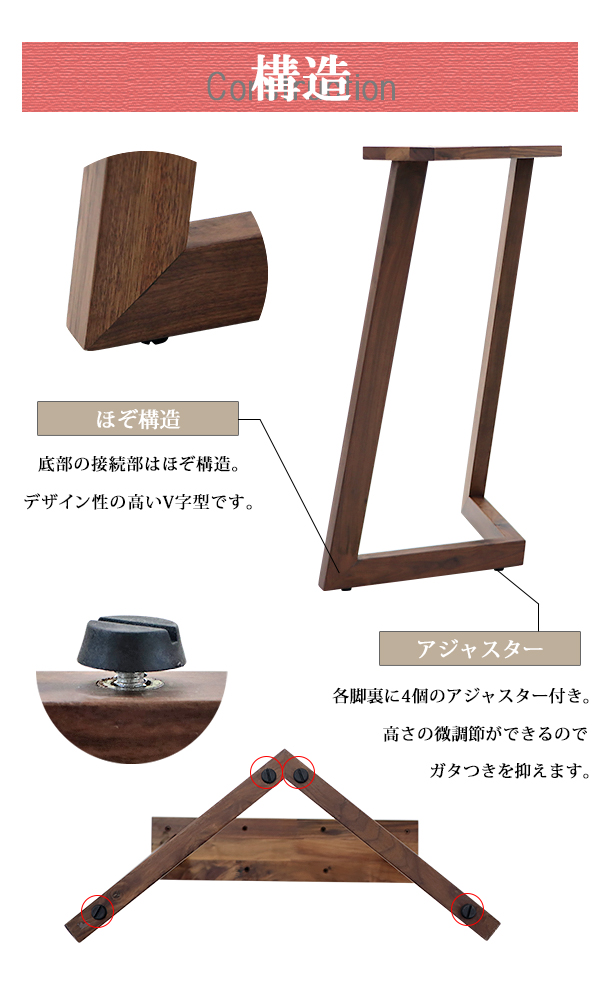 | 材質 | ブラックウォールナット(無垢材)(PU塗装)、鉄[ネジ]、プラスチック[アジャスター]、炭素鋼[アジャスター] |