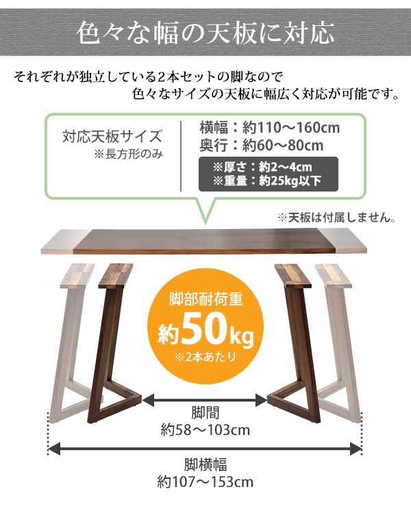 ■こちらの商品は、脚部のみの販売になります。 ■空間に高級感と華やかさを与えてくれる美しい木目のテーブル用脚部です。 ■アジャスター付きなので高さの微調節ができ、ガタつきを抑えます。 ■材質:ブラックウォールナット(無垢材)(PU塗装)、鉄[ネジ]、プラスチック[アジャスター]、炭素鋼[アジャスター] ■重量:約5.45kg(2本あたり) ■対応天板 形状:長方形 ※正方形や円形の天板には対応していません。テーブルが倒れる危険性があるので使用しないでください。 サイズ:約W 110〜160x約D 60〜80cm 厚さ:約2~4cm 重量:約25kg以下 ■耐荷重:約50kg(2本あたり) ■数量:2本 ■付属品:ネジ16本、アジャスター8個 ※天然木のため、木目に関しては一点一点が異なります。あらかじめご了承ください。 ※商品には黒い部分(木の穴や節などの修復部分)が数か所ある場合がございます。品質には問題ございませんので、ご安心ください。ただし、商品の性質上黒い部分の大きさや数は天板一点一点異なります。よくご検討の上、ご購入をお願い致します。 ※天板への取り付けにはインパクトドライバーとドリルが必要です。お客様でご用意下さい。 ●湿気のある場所、直射日光の当たる場所に置かないでください。 ●汚れた場合には水拭きし、その後よく乾かしてください。洗剤は使用しないでください。 ●新品商品ではありますが、輸入商品の為、多少の擦り傷などがある場合がございますので、ご納得の上ご購入下さいませ。 ●ご購入後、お客様ご都合によるご返品、ご返金等は一切お受け致しておりません。 ●本商品を使用した際に発生したトラブル、事故につきまして、当社は一切の責任を負いません。ご使用に関しましては、全て自己責任にてお願い致します。 |