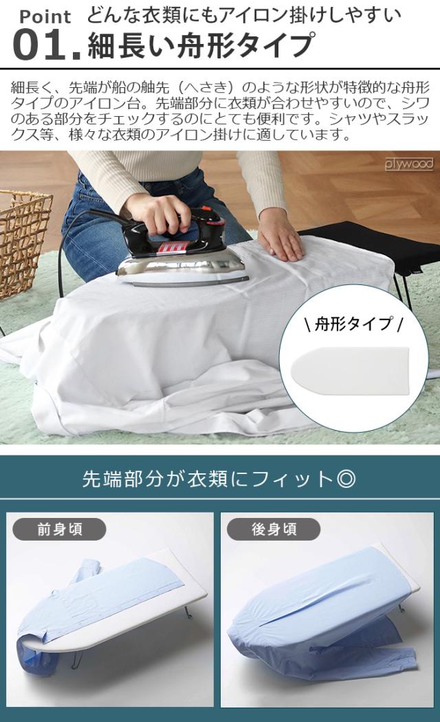 おしゃれな収納グッズを多数発信する山崎実業の「tower(タワー)」シリーズから、シンプルでスタイリッシュな舟型アイロン台のご紹介です。細長く、先端が舟の舳先(へさき)のような形をしている形状は、シャツやスラックス等、様々な衣類のアイロン掛けに適しています。カラーはお部屋に馴染みやすいホワイトとブラックの2色展開。使いやすさだけではなく、デザイン性にも優れており、特にブラックは脚部分までブラック塗装にこだわったデザインが特徴です。使わないときは脚をたためばコンパクトになるので、隙間などに収納できます。
