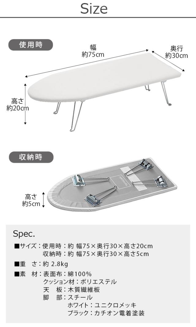 | 使用時:(約)幅75×奥行30×高さ20cm 収納時:(約)幅75×奥行30×高さ5cm |