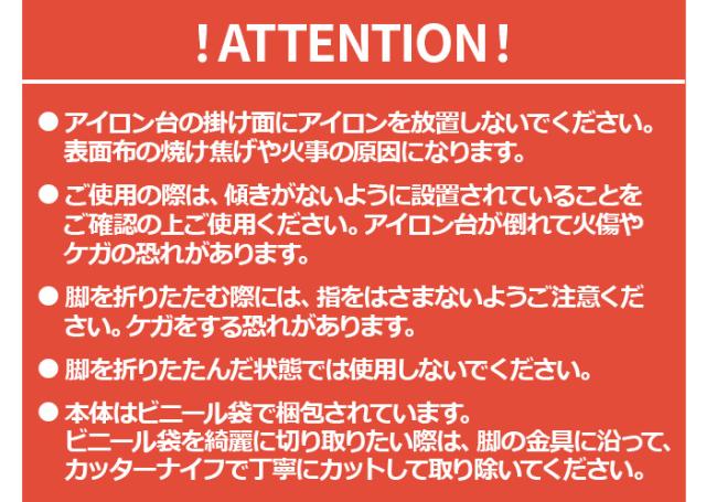 | アイロン台の掛け面にアイロンを放置しないでください。表面布の焼け焦げや火事の原因になります。 ご使用の際は、傾きがないように設置されていることをご確認の上ご使用ください。アイロン台が倒れて火傷やケガの恐れがあります。 脚を折りたたむ際は、指をはさまれないようご注意ください。ケガをする恐れがあります。 脚を折りたたんだ状態では使用しないでください。 本体はビニール袋で梱包されています。ビニール袋を綺麗に切り取りたい際は、脚の金具に沿って、カッターナイフで丁寧にカットして取り除いてください。 アイロン台のご使用後はよく乾かしてから収納してください。スチームの水分が残ったままになると悪臭やカビの発生の原因となります。 濡れたままの衣類のアイロン掛けはお止めください。色落ちの原因になります。 |