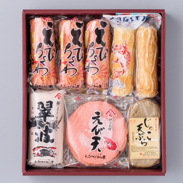 特選えびちくわ3本、じゃこ天3枚入り1袋、えび天2枚入2袋、焼板蒲鉾1本、鯛ちくわ1本、 かにちくわ1本