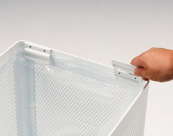 ずれやすい袋をしっかりと押さえることができる、取り付け簡単ワンタッチのポリ袋止め付きです。ゴミ箱の本体容量は85Lで、別売りのダストボックス用ポリ袋90Lが使用できます。