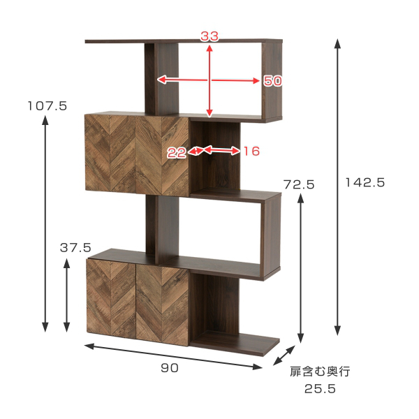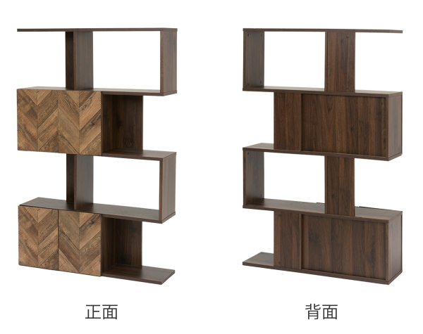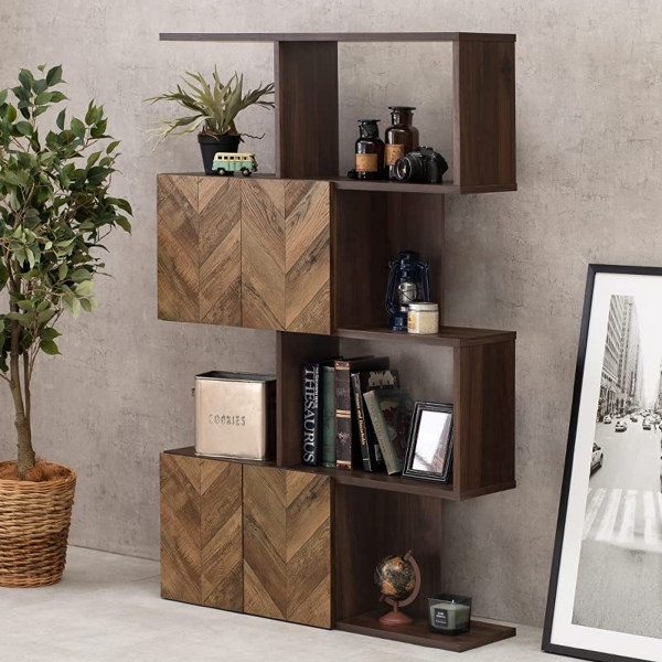 オープンラック 4段 ディスプレイラック 矢貼り風 アクセント扉付 幅90cm ( S字オープンラック ヘリンボーン柄 収納ラック A4サイズ 対応 S字ラック ジグザグラック 収納棚 多目的ラック 木目調 ブラウン 背面化粧 )