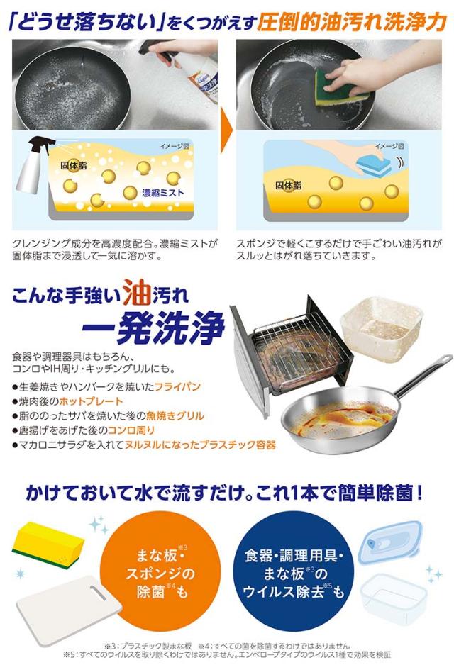 ●「どうせ一度では落ちない」とあきらめていたプラスチック容器、フライパン、コンロなどのしつこい油汚れを、一発洗浄ですっきりと落とせる、スプレータイプの台所用洗剤。