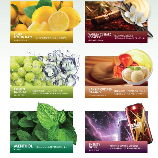 | 内容 | リキッド単品:お好きなフレーバー(1ml / 本) ※当店のリキッド専用デバイスをご使用ください。 リキッド + デバイス セット:デバイス(510規格)+ お好きなフレーバー(1ml / 本) 原材料名 CBD CBN CBG CBC CBDV 香料 |