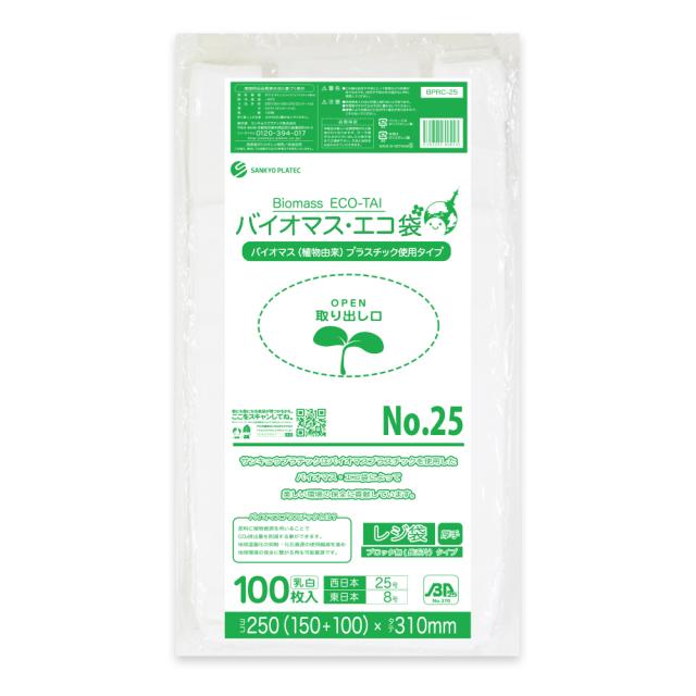 【バラ販売】BPRC-25bara 100枚 バイオマスプラスチック使用レジ袋 ノンブロックベロ付きタイプ(長舌片) 西日本25号(東日本8号) 0.013mm厚 乳白 100枚