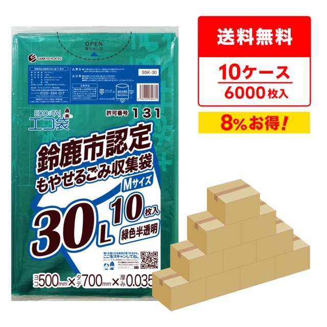 【まとめて10ケース】SSK-30-10 鈴鹿市指定袋 もやせるごみ用 30リットル Mサイズ 0.035mm厚 緑色半透明 10枚x60冊x10箱/ ゴミ袋 ごみ袋 送料無料