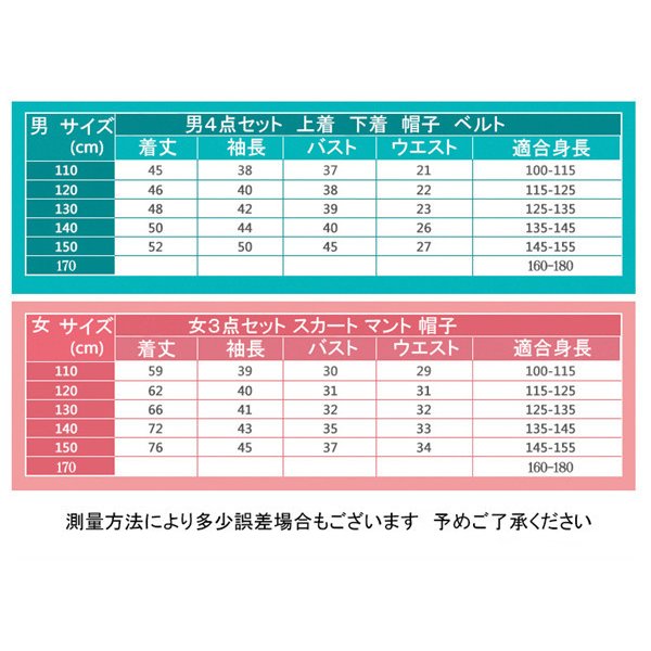●セット内容 男子供:帽子 上着 下着 ベルト サンタ袋 5点セット 女子供:帽子 ワンピース マント サンタ袋 4点セット (※他は商品に含まれません) ★サイズ:(単位:cm)サイズ表によって選択ください。