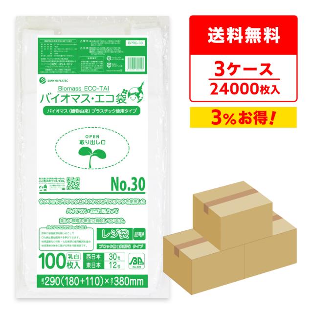 【まとめて3ケース】BPRC-30-3 バイオマスプラスチック使用レジ袋 ノンブロックベロ付きタイプ(長舌片) 西日本30号(東日本12号) 0.014mm厚 乳白 100枚x80冊x3箱 送料無料