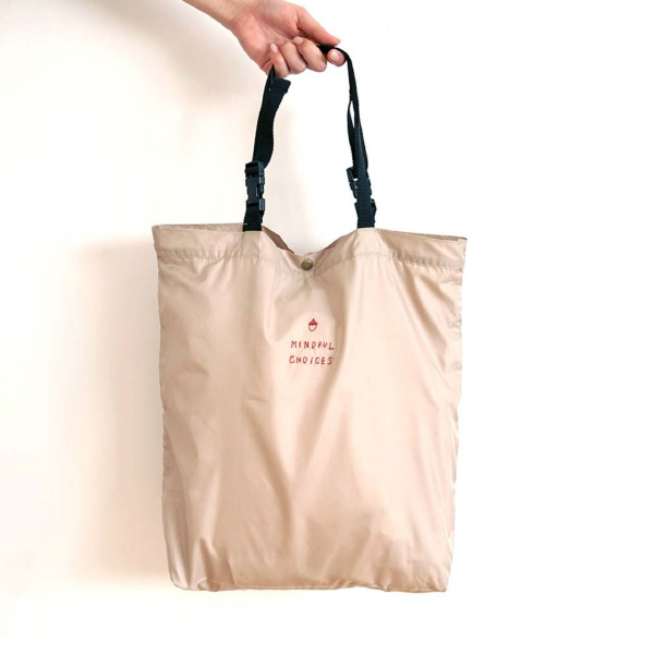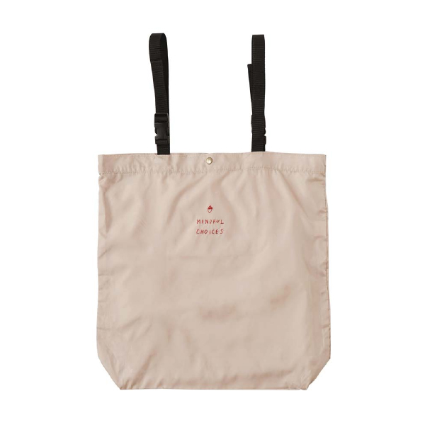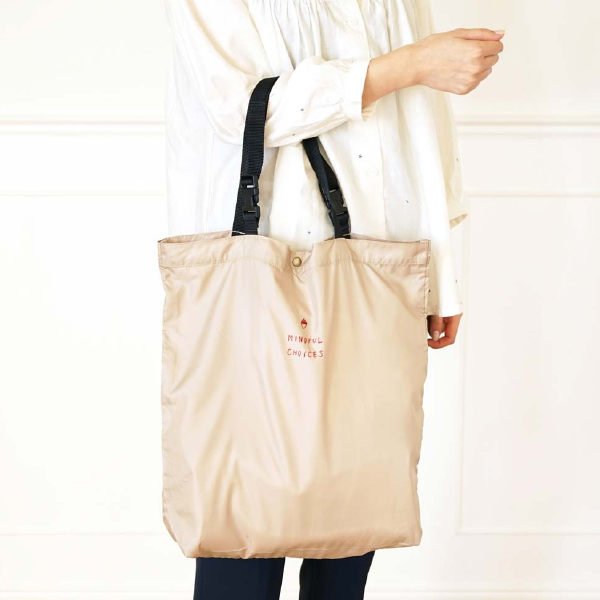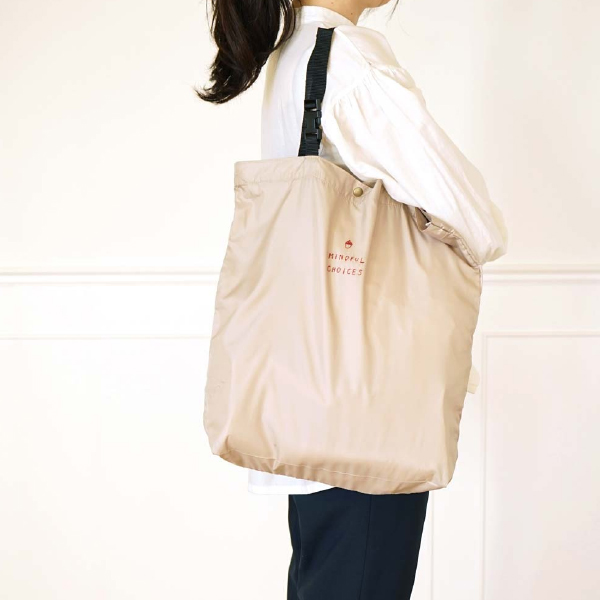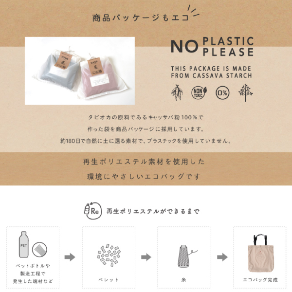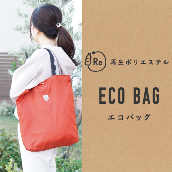 再生ポリエステルを使用したエコバッグ。ペットボトルや製造工程で発生する端材などを原料としています。