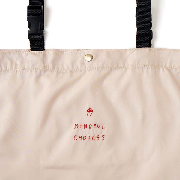 ナチュラルなコーデに似合うベージュ地に赤い刺繍入りのデザイン。