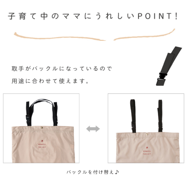 ベビーカーや車のヘッドレストなどに掛けられるように、取手にバックルを付けました。