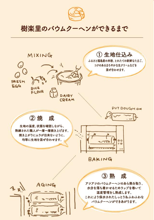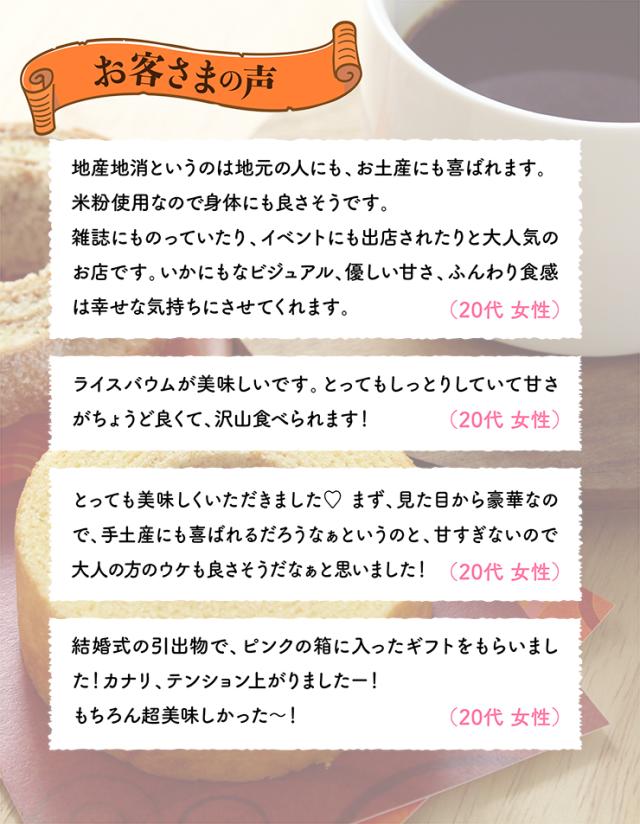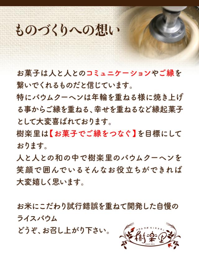 小麦を一切使用せず、福島県産の米粉を使用し焼き上げたライスバウム。発酵バターを使用し風味よく、外はサクッ、中はしっとりに焼き上げた堅焼きのライスバウムです。