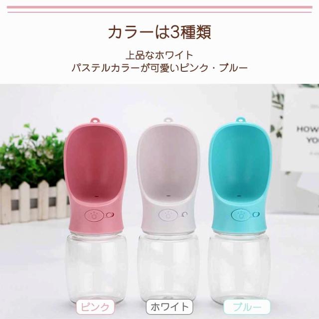 | 商品の説明 | 片手で簡単に給水出来る ペット用給水ボトル カラーは3種類 上品なホワイトにピンクとブルーのパステルカラーがキュート! 見た目も可愛く、くびれのある曲線は持ちやすく実用的。 背面には突起があり滑り止めに。 対落下性と耐久性があるので野外でも持ち運べます。 ロック機能があるのでカバンに入れても濡れず、 安心しておさんぽや旅行にも持っていけます。 ストラップも付いているから、手首にかけたりカバンに付けても◎ 飲み口が広いので小型犬から大型犬まで幅広い犬種に使用でき猫や小型動物にもオススメです。 食品グレードで出来ているので、安心してご使用いただけます。 肉球マークを押すと給水ができます。 肉球マークの右側にはロックボタン。 ボタンを左にスライドさせるとロック状態になり、右に戻すとロック解除になります。 |