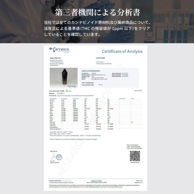 | 新基準適合 | 2024年12月12日施行された「大麻取締法及び麻薬及び向精神薬取締法の一部を改正する法律」により、CBD製品に含まれるTHCの残留値に新たな基準値が設けられました。現在、当社から販売しているすべてのカンナビノイド製品に関しましては、原材料の受け入れから最終製品の完成までに複数回の第三者機関による品質検査を実施しており、新基準値に適合していることを確認しております。これまで通り、高い品質の製品をお届けしてまいりますので、安心してご使用ください。 |